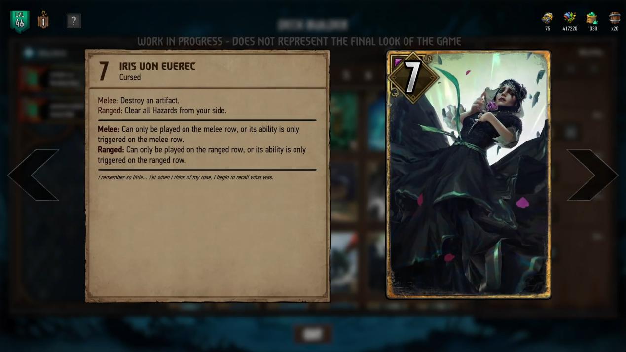 为了更专注与行列本身的功能,牌桌变成了两行设计,这是在三行设计下我们很难在同时兼顾趣味性和平衡性前提下,为此而做出一些改变。因此,《巫师之昆特牌》将会拥有全新的”行列限定“技能:我们不会限制你将卡牌放置在哪一行,但某些能力只会对特定的行列起作用,你手中的卡牌甚至可以在近战行和远程行里有不同的技能。并且提示框中的内容也会更加简洁,便于阅读。