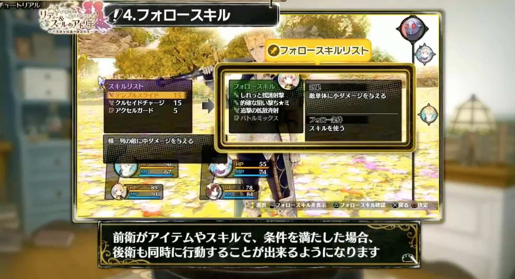 本作战斗方面与前作有所不同,加入了前卫和后卫阵型以及“跟随技能”系统,当前卫队员发动的技能或使用的道具满足一定条件时,后卫队员也会跟随前方一起行动,跟随技能多种多样,可以积极尝试。