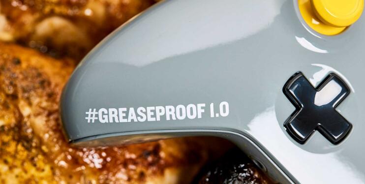 这款手柄与ColorWare合作,在其表面覆盖了氨基甲酸乙脂涂层,能够让手柄不会被油脂、酱料和调味品附着。是真正的“吃鸡”专用手柄。这款手柄全球限量200枚,每个都有编号,并有#greaseproof1.0专属标记。
