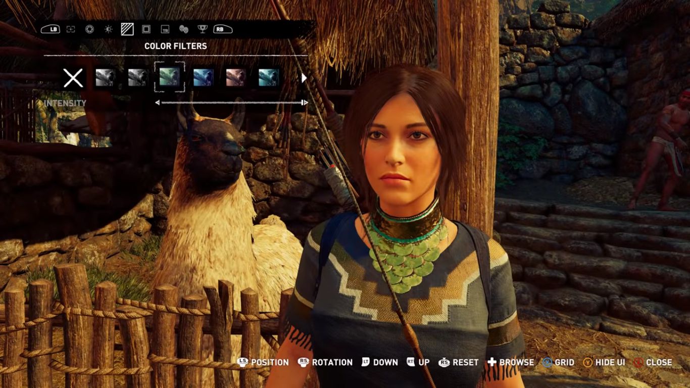 演示视频中劳拉身穿土著服装,在地图中进行探索。玩家可以随时呼出拍照功能,即时进行拍摄。本作中的照相模式可谓功能强大,可能平时熟悉P图的玩家会更加得心应手。玩家可修改的项目包括焦距、曝光、滤镜、角度、劳拉的表情,还可设定相框与水印。