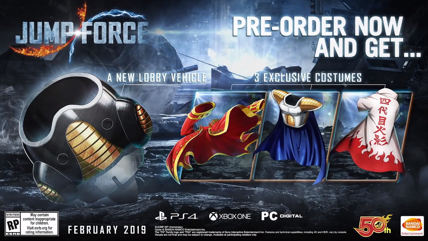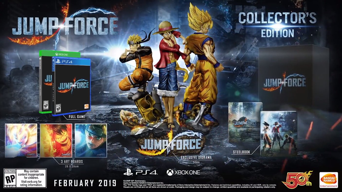 《Jump力量》有可能会在明年2月份登陆PS4、Xbox One和PC平台,同时将会发售季票,内含9名追加角色。目前角色情报与售价暂未公开。预购《Jump力量》可获得三套独家服装,以及弗利萨的特殊驾驶舱,这个驾驶舱可以在大厅界面展示。《Jump力量》典藏版售价260美元,内含30厘米高的悟空、路飞、鸣人手办。同时典藏版内还包含实体游戏、三张艺术卡片、铁质收藏盒,以及其它尚未公开的内容。