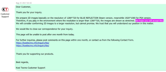 光荣官方表示:“我们为《蓝色反射 Blue Reflection》Steam版本准备了1280*720分辨率的图片,而为PS4版本准备的图片则是1920*1080分辨率。因此,如果你的游戏环境所用分辨率高于1280*720,那么所得到的图像都是拉伸过的。我们希望你们能够接受。”不过目前该回应已被删除。