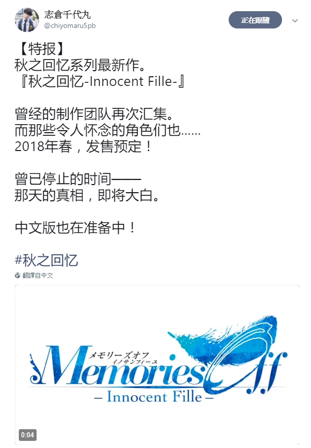5pb.母公MAGES.会长志仓千代丸在个人官方推特宣布,知名恋爱游戏《秋之回忆》系列最新作《秋之回8无垢少女(メモリーズオフ-Innocent Fille-)》将于2018年春季问世,同时中文版也正在准备中。