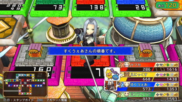 关于这次特色之一的联机游戏部分,白石确认PS4 版与PS Vita版以及日文版与中文版之间都能跨平台跨语言版本联机游玩。为避免有玩家快输了就故意断线赖皮,服务器会把这些恶意断线的行为记录下来,让这些坏孩子以后只能跟其他坏孩子联机。不过玩家也不必太过担心,因为联机不稳偶尔断线的状况,还不至于被认定为坏孩子。联机时玩家可以使用DQ & FF 角色的表情文字贴图来沟通,就像LINE贴图那样。这些贴图都是由角色插画家天野シロ绘制的,非常有趣。