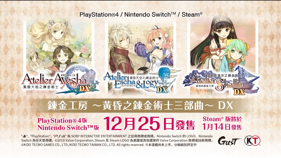 《炼金工房黄昏三部曲》DX升级版于TGS 2019东京电玩展上正式公开,将收录《亚莎的工作室:黄昏之大地的炼金术师》《艾斯卡与罗吉的工作室:黄昏之空的炼金术士》《夏莉的工作室:黄昏之海的炼金术士》三款作品及其所有扩展内容。玩家可以选择单独购买其中的任意一作(售价5,184日元,约合343元),或入手三部合集版(售价14,904日元,约合987元)。