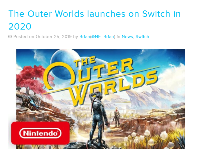 发行商Private Division透露《天外世界》将会于2020年登陆任天堂Switch平台。