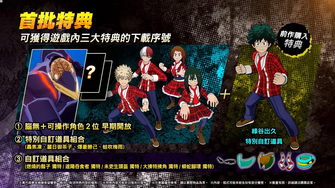 对战动作游戏《我的英雄学院:唯我正义2》改编自堀越耕平目前于《周刊少年JUMP》连载的人气漫画,为系列第二款作品。故事描写登场人物们运用被称为 “个性” 的特殊能力,挺身迎战恶势力 “敌人(ヴィラン)”。本作登场角色不仅包含了2018年8月发售的前作(PS4/Switch)角色,还将追加众多新角色。