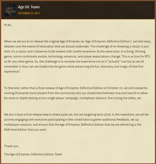 官方表示,该作品是一部经典,应该认真的看待他们,同时在技术进步和玩家期望等情况下,对于重新创造体验是一个挑战。为此,与其在10月19日推出《帝国时代:终极版》最终版,官方将改采邀请数千名玩家参与封测,以针对游戏内细节进行测试。
