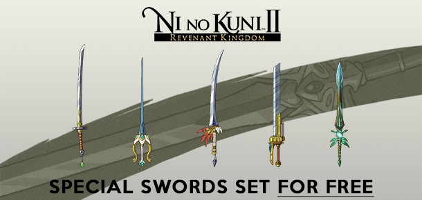 《二之国2:亡灵之国》预购奖励为特殊武器包,共计5把特殊武器。它们可以用来帮助主人公“Evan”以及“Roland”对抗邪恶势力。