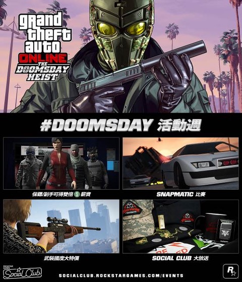 Rockstar Games 宣布,为庆祝「末日抢劫」今日于GTA线上模式推出,将为玩家提供许多大赚一笔的大好机会。即日起至2017年12月18日前,参加「末日抢劫」Social Club抽奖活动试手气,有机会获得全套GTA 5商品!或参加#DOOMSDAY Snapmatic 比赛,考验Snapmatic摄影技巧,还可趁机获得多项游戏内奖励,包括保镖/ 副手双倍GTA游戏币薪资,或是趁机抢购众多武装国度大特价商品!
