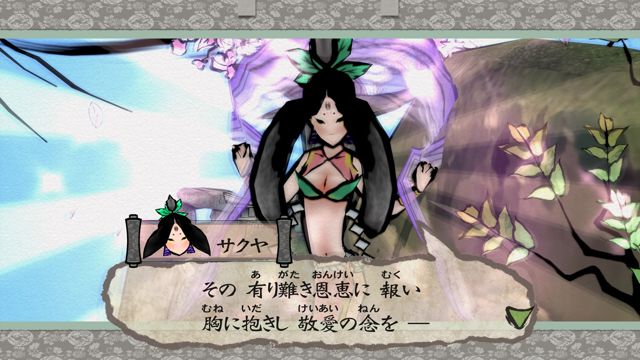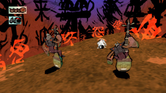 最让人吃惊的是,这种异想天开的故事化为游戏后,居然能如此毫无违和感。“和风绘图” 部分,本作将背景及角色轮廓以墨线描绘,被黑暗垄罩的世界则呈现水墨画风格,待天照让自然复原,气氛就会变得宛如浮世绘色彩一般缤纷。就像是滝平二郎的剪画,或是藤城清治的皮影戏般,充满复古氛围的配色。另一方面,与妖怪们的战斗场面同样采用了原色系,却特别强调充满恶意的气氛,演绎出不安及危机感。