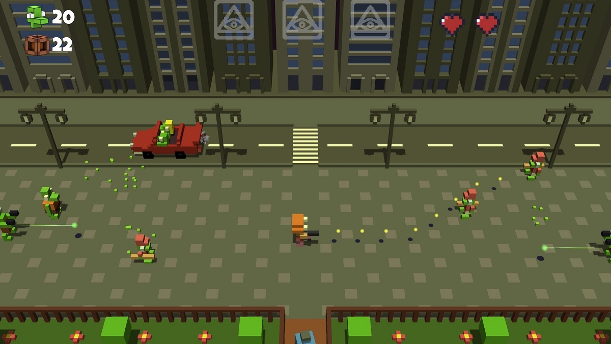 这是街机风的3d像素小游戏。游戏讲述的是人类都市遭遇变异昆虫的袭击,玩家将扮演勇者决定亲自寻找幕后黑手,并利用核弹予以毁灭的冒险故事。