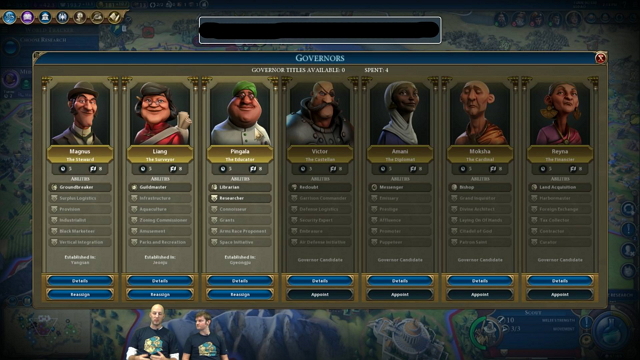 另一个新系统就是总督治理。玩家有7名总督可以选择,每种都有自己独特的技能树,你可以雇佣他们,并将他们派遣到任何一个城市管理城市的忠诚度,他们升级后可以提供不同的技能加成。红衣主教Moksha可以帮助玩家将自己的宗教传播到世界的任一个角落;管家Magnus擅长将工业利益最大化,并剥夺大自然的土地和资源,如果想掠夺自然资源的话,那他是最适合的总督人选。