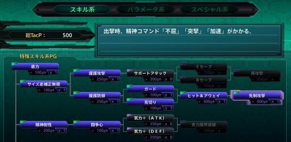 本作的特殊技能采用了技能树系统,玩家可以使用战斗中获得的《TacP》点数来开发新的特殊技能!技能方案是可以让每一个机师修得新技能的系统,尽管会有重复,每一位机师都可以最多修得30个技能。工厂系统是老玩家熟悉的Magic的效果定制系统(3选一)。