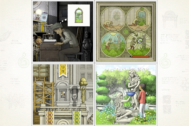 你在这几幅画框之间探索、排列和堆叠,有时甚至从一张画框中分离出两个图层,这些四散在画框中的杂乱线索会以一种不可思议的方式组合在一起。在一幅场景里,笔者从天上偷了一颗星星来点亮台灯。在另一幅场景里,笔者通过重叠门的图案、旋转古代遗迹并将转动的瓷盘当成齿轮,来指引主角在几张老照片中穿梭。在这些谜题中,时间和空间不受物理定律约束,可以自由的组合切换,同时出现在一幅场景中。笔者发现自己回到了过去或是到了遥远的土地上,在那片土地上的一举一动竟然会影响现在。这是一种非常巧妙的机制,它能激励玩家去发掘每个场景背后新颖神奇的联系,在这个过程中跟随故事一起回想过去与得失。笔者的每一步都是《画中世界》神话的一种启示。这些都是庞大复杂体系的一小部分而已。