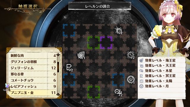 决定制作的道具后,再来选择投入的材料。如果在这个时候先丢入可以成为触媒的材料,在调合面板上就会出现带有额外效果的特别方格。