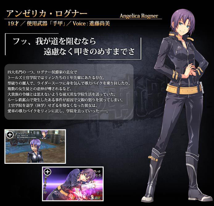 19岁。罗格纳侯爵家嫡女,黎恩他们在托尔兹军官学院的学姐。处处标新立异的美人,身披机车服骑着导力摩托车横冲直撞,传言还与多位女生保持着恋爱关系,享受着令人完全联想不到大家闺秀的学院生活。因卢雷铁矿山发生的事件触怒父亲,导致从军官学院退学(休学)的她,将爱车导力摩托托付给黎恩后离开了学院——