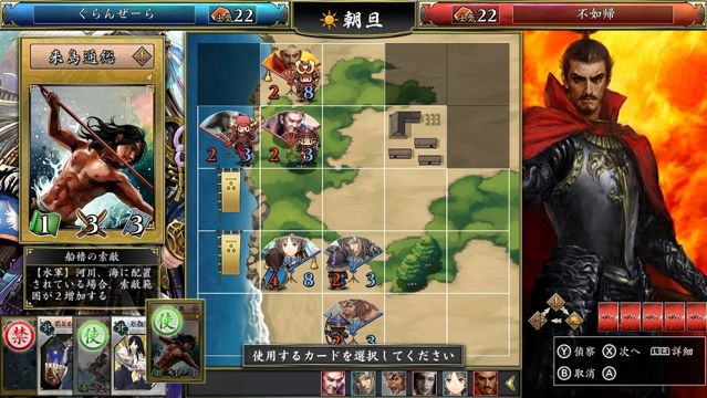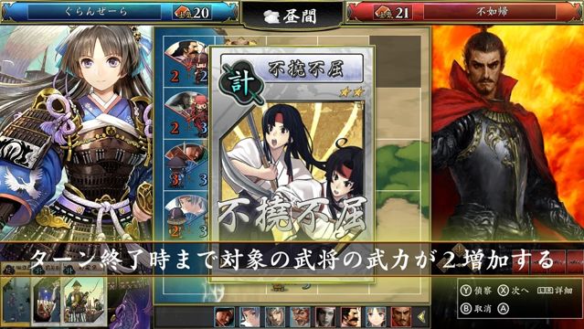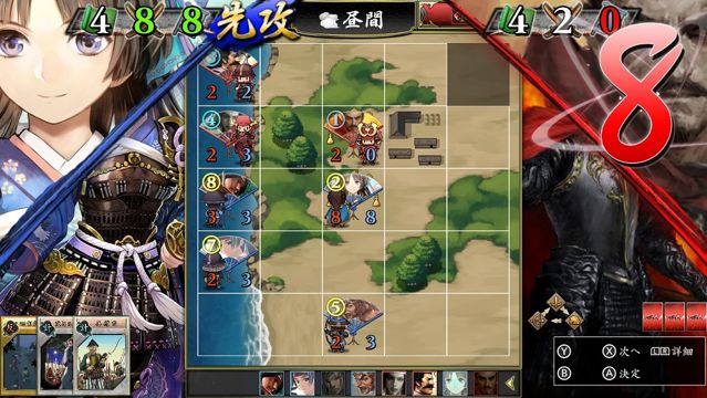 从手牌使用武将卡,让单位出现于合战场。单位设有足轻/骑兵/弓众/铁炮/忍者等兵种,移动范围及攻击范围各有不同。另外每张武将卡设定了固有武将特技,可组合复数武将特技发挥出相乘效果,甚至有些卡片独自的效果就能翻转战局。另外,合战也有天候、时刻、地形等要素,例如雨天无法使用铁炮,或是在夜间能见度会下降,充分掌握各种战况将成为胜利的关键。