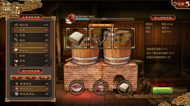 酒入豪肠醉更狂,北宋的江湖豪侠们不但会喝酒还要会酿酒,玩家进入「开封」后前往酿酒铺,便会开启「酿酒」系统。接下来可自由放入喜欢的酿酒材料,酿酒过程中,玩家要挑战如何为品质把关,酿酒时控制火候就相当重要,这次考验的是玩家的控温平衡力,火候适中才能酿出美酒。喝下酿造成功的美酒将让大侠们在战斗中功力大增唷!