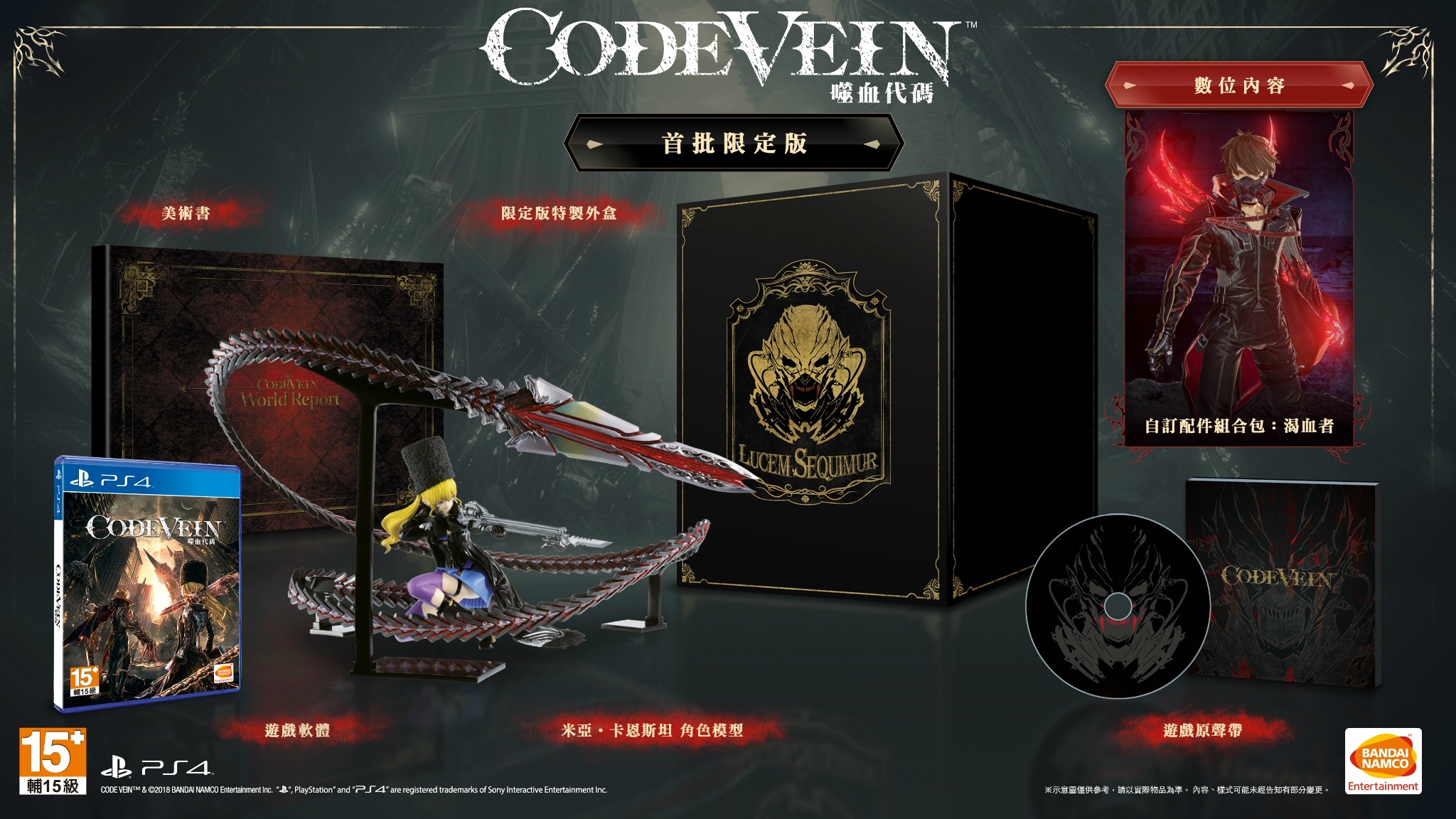 台湾万代南梦宫娱乐今天正式公布了动作RPG游戏《噬血代码(Code Vein)》繁体中文版的首版特典以及豪华版、限定版内容情报。《噬血代码》将于9月27日登陆PS4、Xbox One平台,PC版本将于9月28日推出,中文版游戏将与日版同步发售,各位玩家敬请期待。