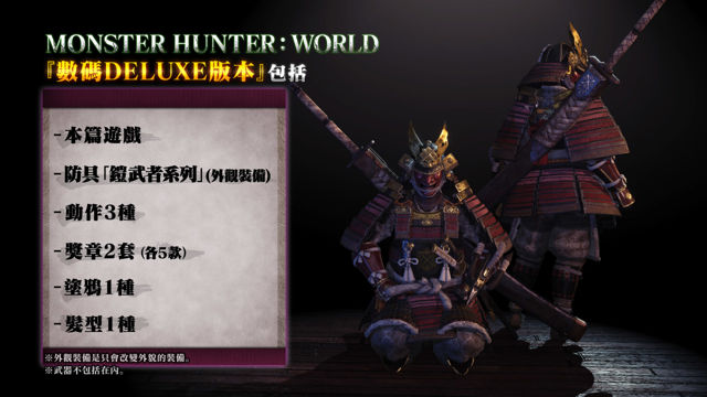 收藏版包括忠实呈现新登场的主要怪物「灭尽龙(ネルギガンテ)」原装模型、直至现在为止将于游戏内登场的新怪物设计草稿及设定资料的「Monster Designs」画册、收录游戏内的10 首曲目的soundtrack CD、以及「Deluxe Kit」的下载码,内容十分丰富,极具珍藏价值,数量有限。