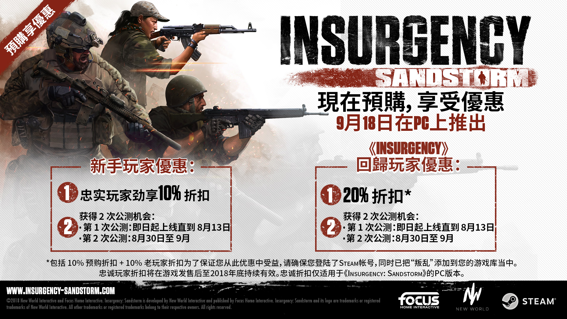 《叛乱:沙漠风暴》日前正在Steam上开启预购促销,原价98元,现价88元(10%优惠),支持简体中文。如果你之前购买过《叛乱》游戏,那么购买《叛乱:沙漠风暴》时可享受20%的优惠。预购的玩家可以获得第二轮BETA测试资格。