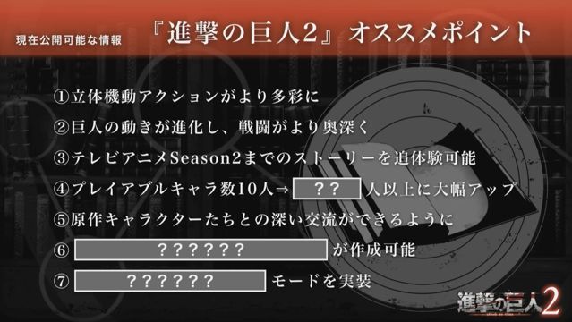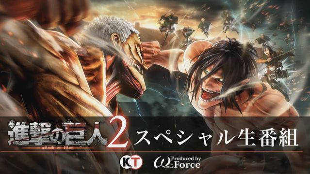 光荣特库摩在东京电玩展的舞台活动中宣布,以在全球相当有人气的动画作品《进击的巨人》的世界观为原作的战术狩猎动作游戏《进击的巨人》系列最新作《进击的巨人2》将在PlayStation 4/PlayStation Vita/Nintendo Switch与Steam平台于2018年初发售。