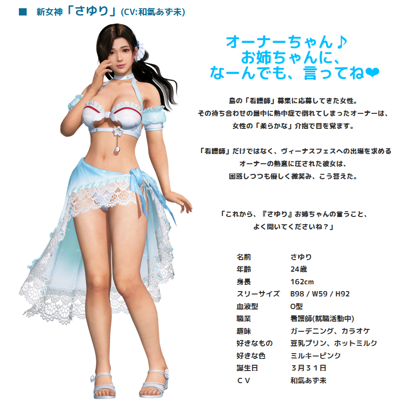 日本光荣特库摩公开了《死或生 沙滩排球 维纳斯假期》新角色“小百合”的一系列新消息。据悉,新角色“小百合”有着邻家温柔姐姐的气息,而且同样拥有非常傲人的身材。