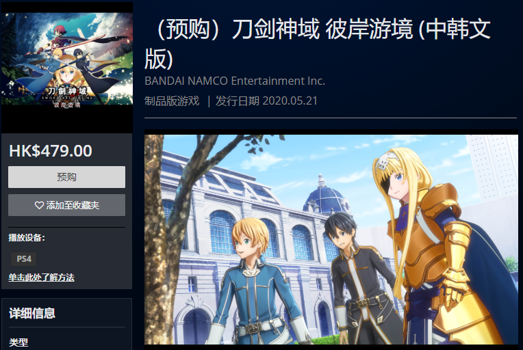 由万代南梦宫发行的漫改作品《刀剑神域:彼岸游境》(中韩文版)正式上架PSN港服商城,并开启预购。该作标准版售价479港币(约合人民币427元),数字豪华版售价749港币(约合人民币668元),其正式解锁日期为2020年5月21日。