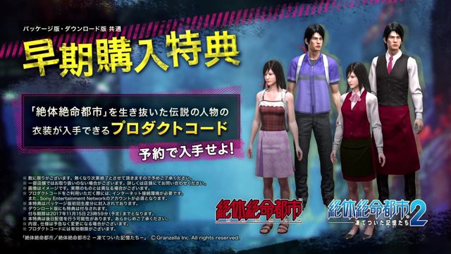 早期购入特典的第一项内容为《绝体绝命都市》系列的合作服装。能让《巨影都市》的男性、女性主角、女主角穿上《绝体绝命都市》的「须藤真幸&相泽真理」的服装、《绝体绝命都市 2(绝体绝命都市2)》的「筱原一弥&藤宫春香」的服装。