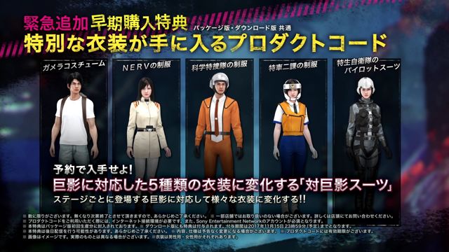 追加的早期购入特典为「对巨影套装」。这是根据所登场的巨影自动变化为5 种服装的套装。(玩家无法自行切换)