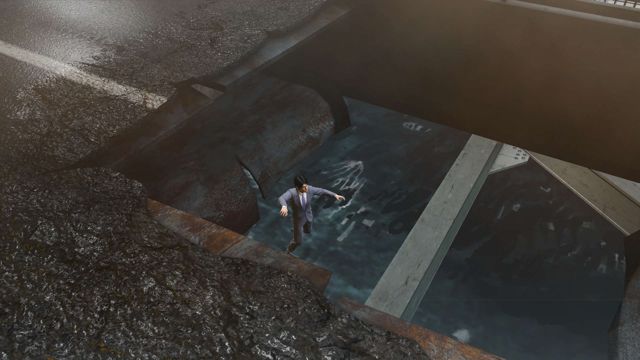 突然崩塌。为了不掉下去尽全力回避度过危机!受摩斯拉与巴特拉激斗所产生的余波而变得脆弱不堪的桥梁。震动于主角周遭引起了崩塌。回避失败就一定会被卷入其中掉下去。