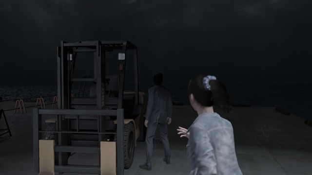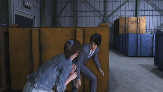 追杀主角等人的柴田与武藤。躲过他们的追踪吧!柴田与武藤会持枪执着地追杀主角等人。为了不被他们发现,沿着货柜阴暗处进行移动。