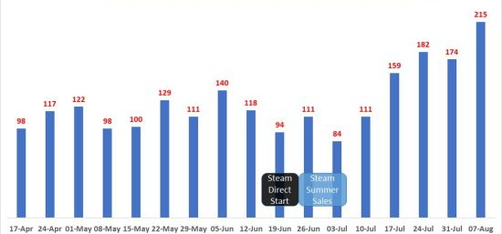 根据第三方统计,仅8月第一周,Steam总共上架了215款游戏。发行数量创造了近期的新高。而7月的第一周Steam仅仅上架了84款游戏。但从那时开始,每周新上架的游戏数目都在增加之中。从初步的情况来看,Steam Direct发展还算不错。