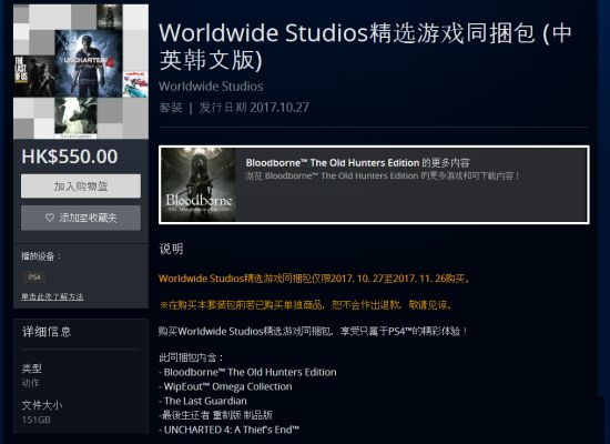 PSN港服今日上架了名为Worldwide Studios精选游戏的同捆包,内含5款PS4游戏大作,购买时间为2017年10月27日-至2017月11月26日。