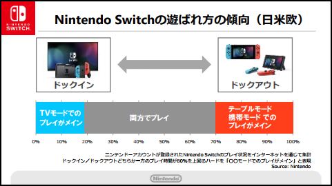 最后谈到Nintendo Switch,可以先从图上看到有两个有趣的小调查,一是透过主机和网路连线回传的资讯,归纳出玩家主要使用何种模式进行游戏的比率,可以看出最多玩家还是TV 模式与手提/ 桌上模式并用,而只以单一模式为主的玩家,则是手提/ 桌上模式高于TV 模式。