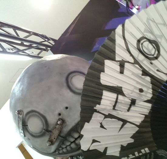 当然,《尼尔:机械纪元》展位上不光有本子。该展位还展出了另外一种周边,那就是扇子。横尾太郎也不甘寂寞,挠有兴趣的把玩了一下,并晒了一下跟扇子的合影。