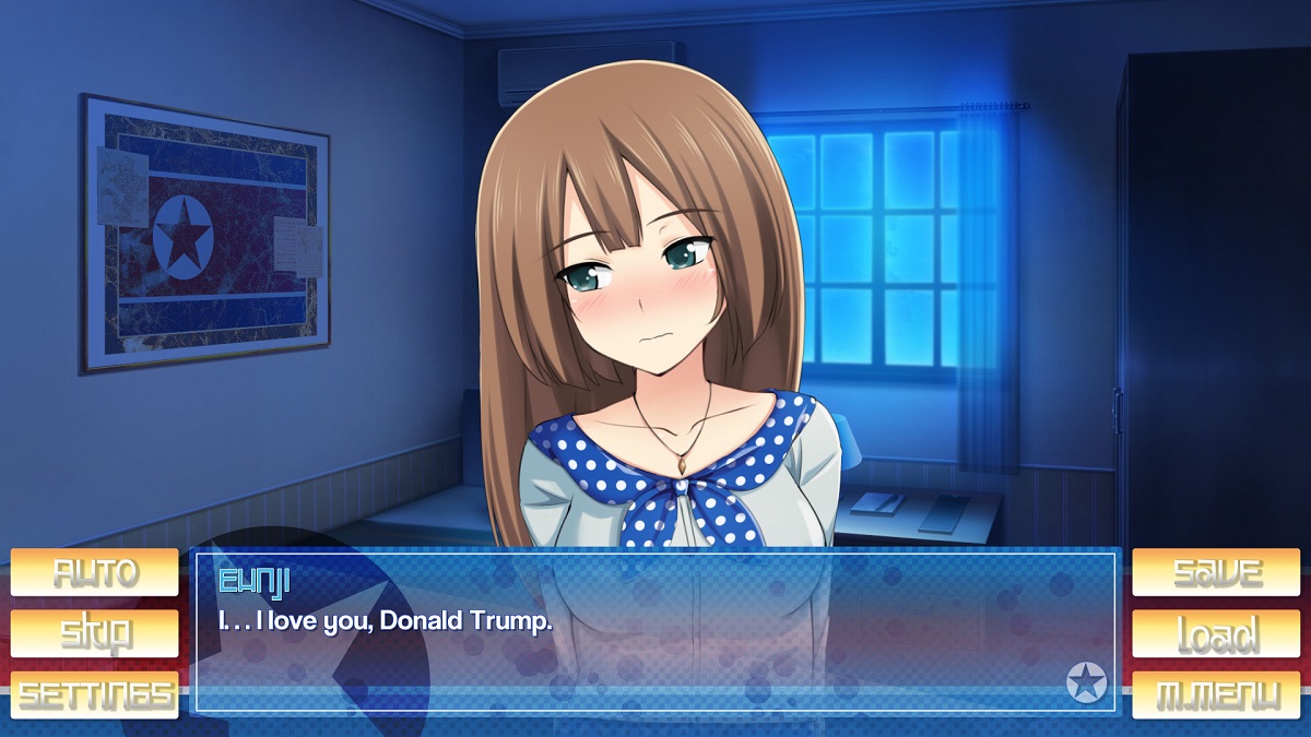 故事发生在2021年,美国再次踏足阿富汗,主人公你是一个士兵,获得了一次度假的机会。没有什么比和来自朝鲜的笔友,Jeong、Eunji一起度过来得更美妙了(其实并不是)。 在朝鲜的主人公如履薄冰,你需要注意不被射杀、处决、非法搜查,或者被定下叛国罪名。 游戏的推进方式和一般的galgame一样,通过选项来决定分支。
